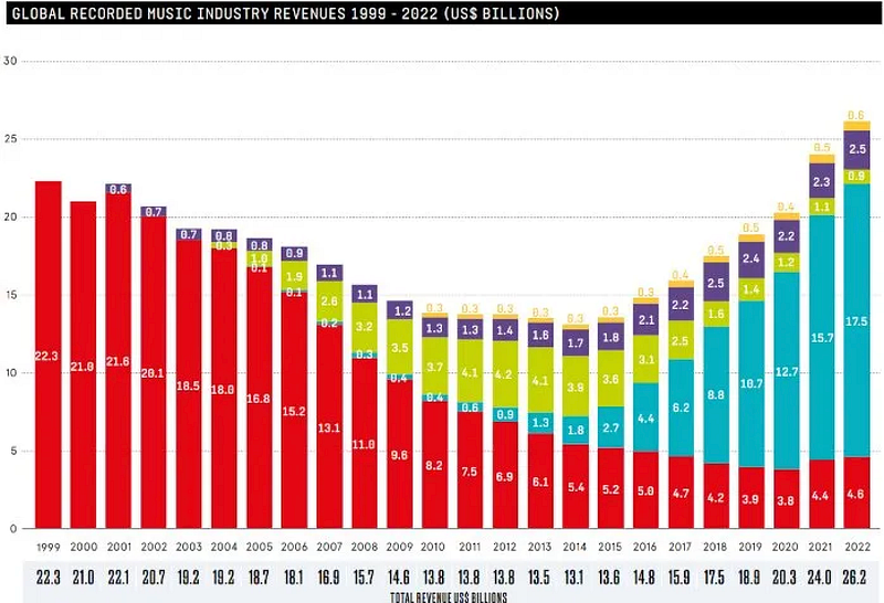 Red: Physical; Purple: Performance; Green: Downloads & Digital Sales; Yellow: Synchronization; Blue: Streaming; Source: IFPI